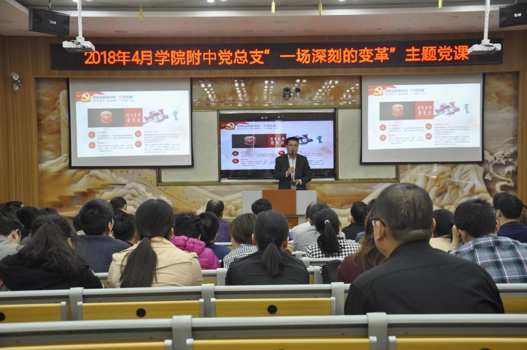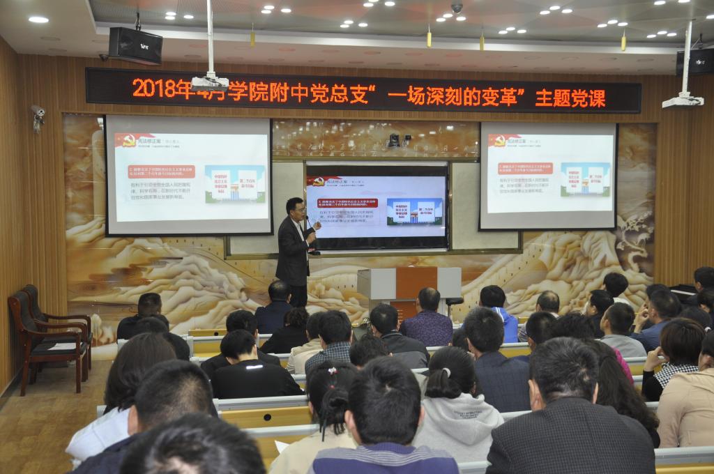 为深入学习“两会”精神及习近平新时代中国特色社会主义思想,提高全体党员干部对两会以来国家形势的认识。4月24日下午,我校党总支书记祁立新为全体党员干部上了一节题为《一场深刻的变革》的党课。党课由党总支副书记、校长田孝民主持。