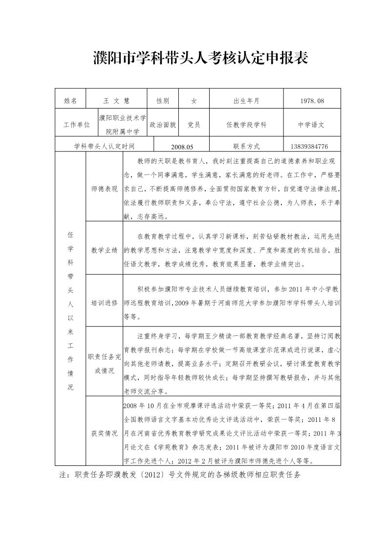 王文慧濮阳市学科带头人考核认定申报表
