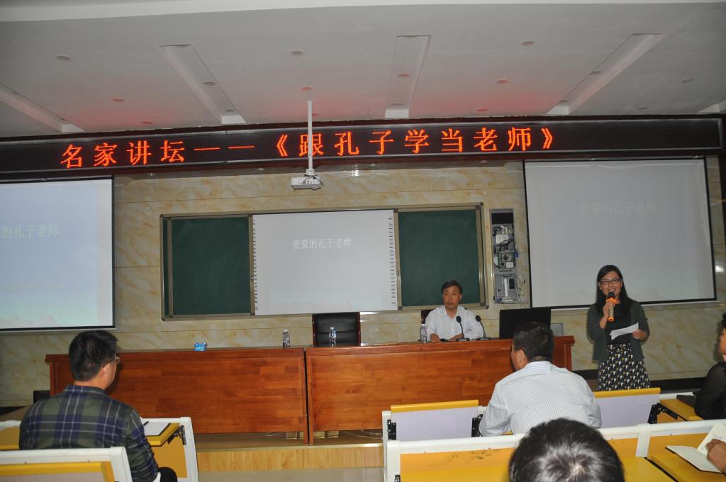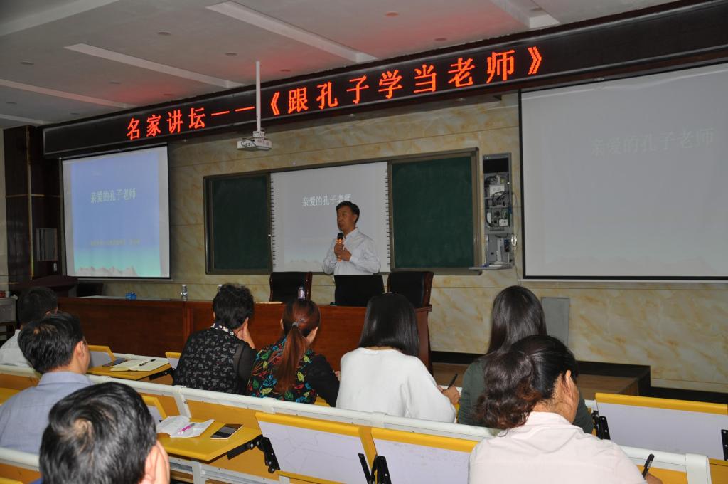 9月28日下午,我校"名家讲坛"在阶梯教室开讲。全体教职工参加了此次活动。"名家讲坛"邀请濮阳名家,走进我校,谈国学、谈读书、谈哲学等,厚重人生,提升素养,促进教师专业化发展。本次邀请到的是濮阳市中小学教研室副主任、省特级教师、市全民阅读促进会副会长、诗经研究会会长张自福先生。张老师与大家分享的主题是——《跟孔子学当老师》。