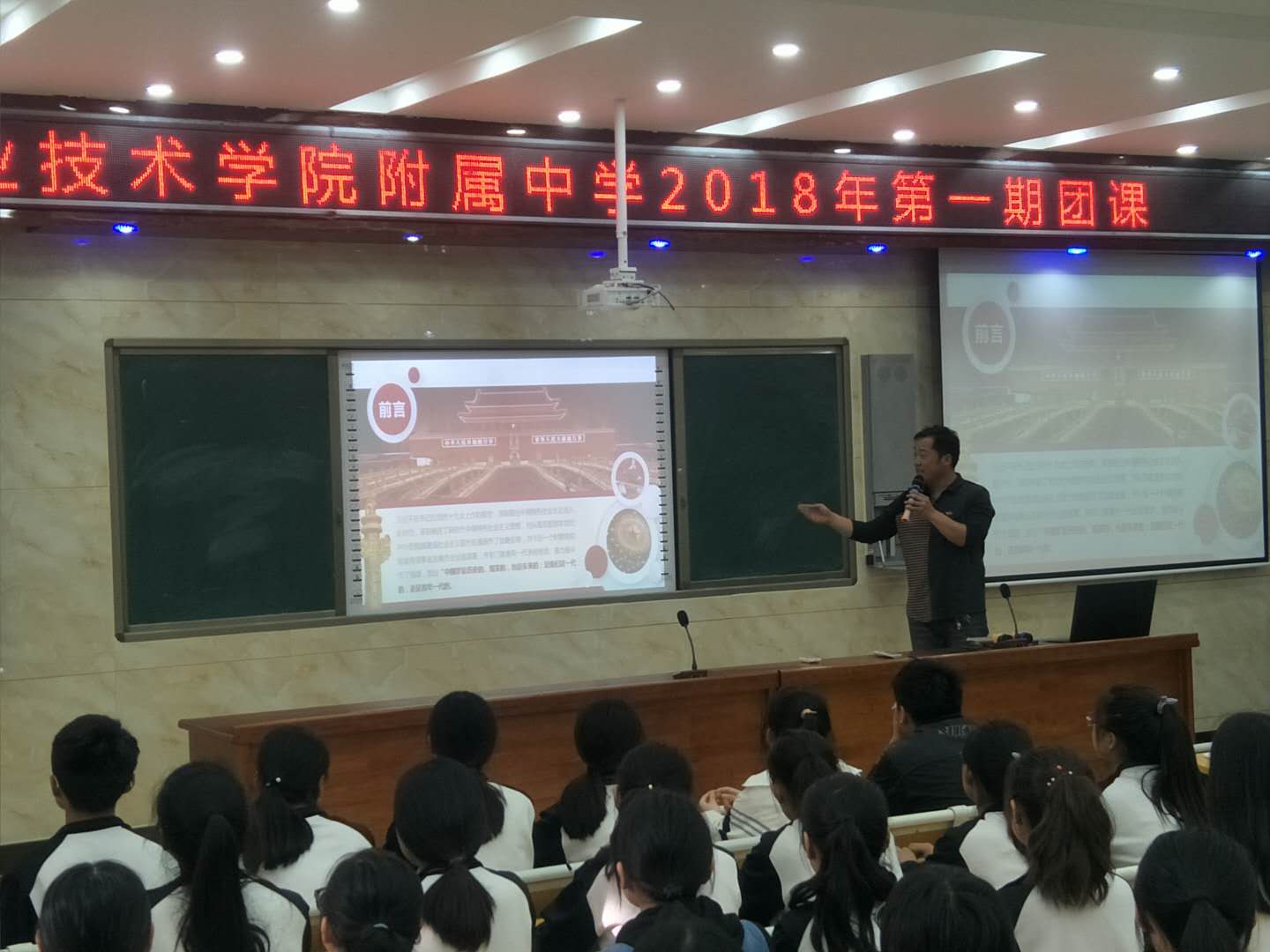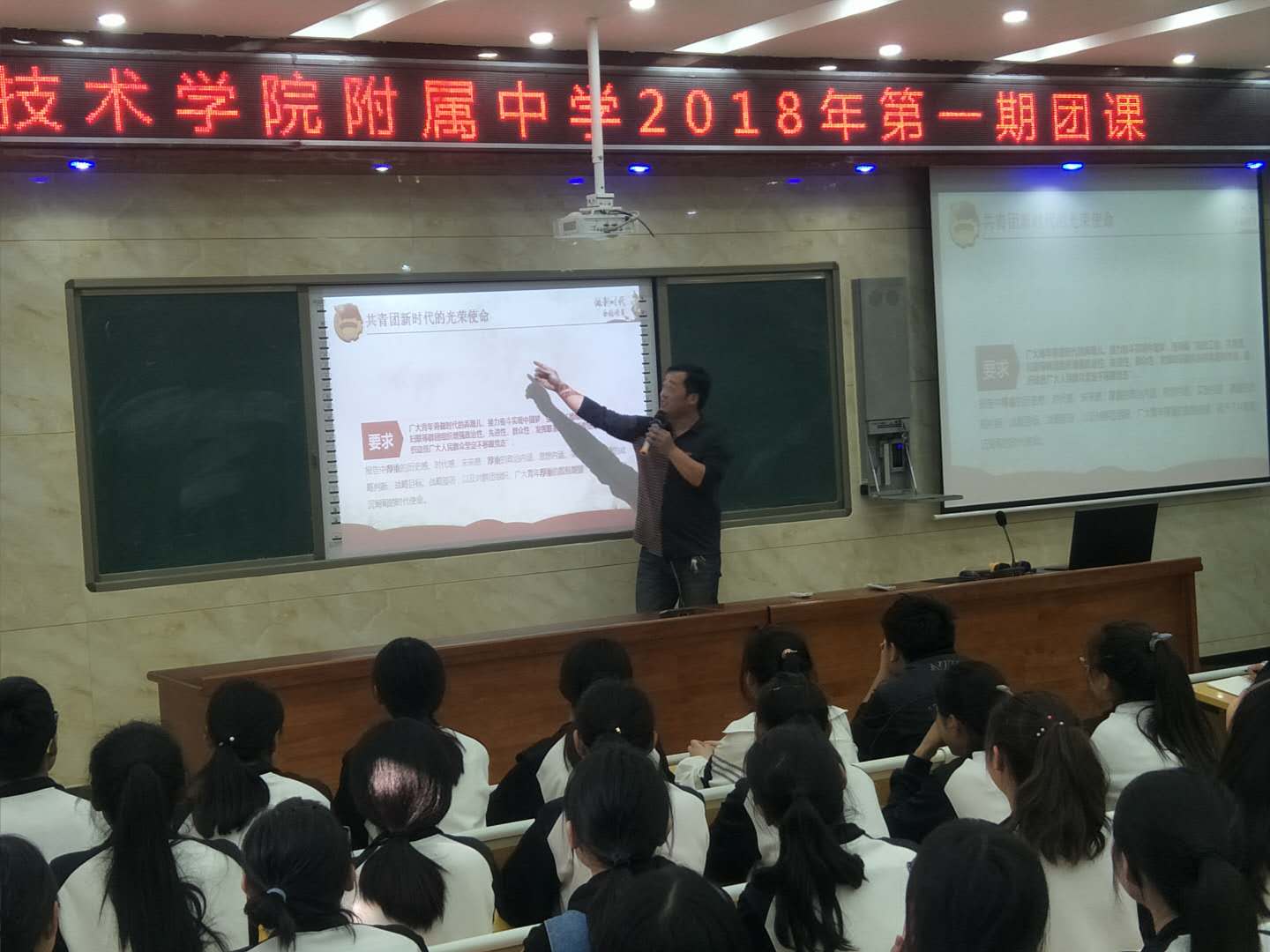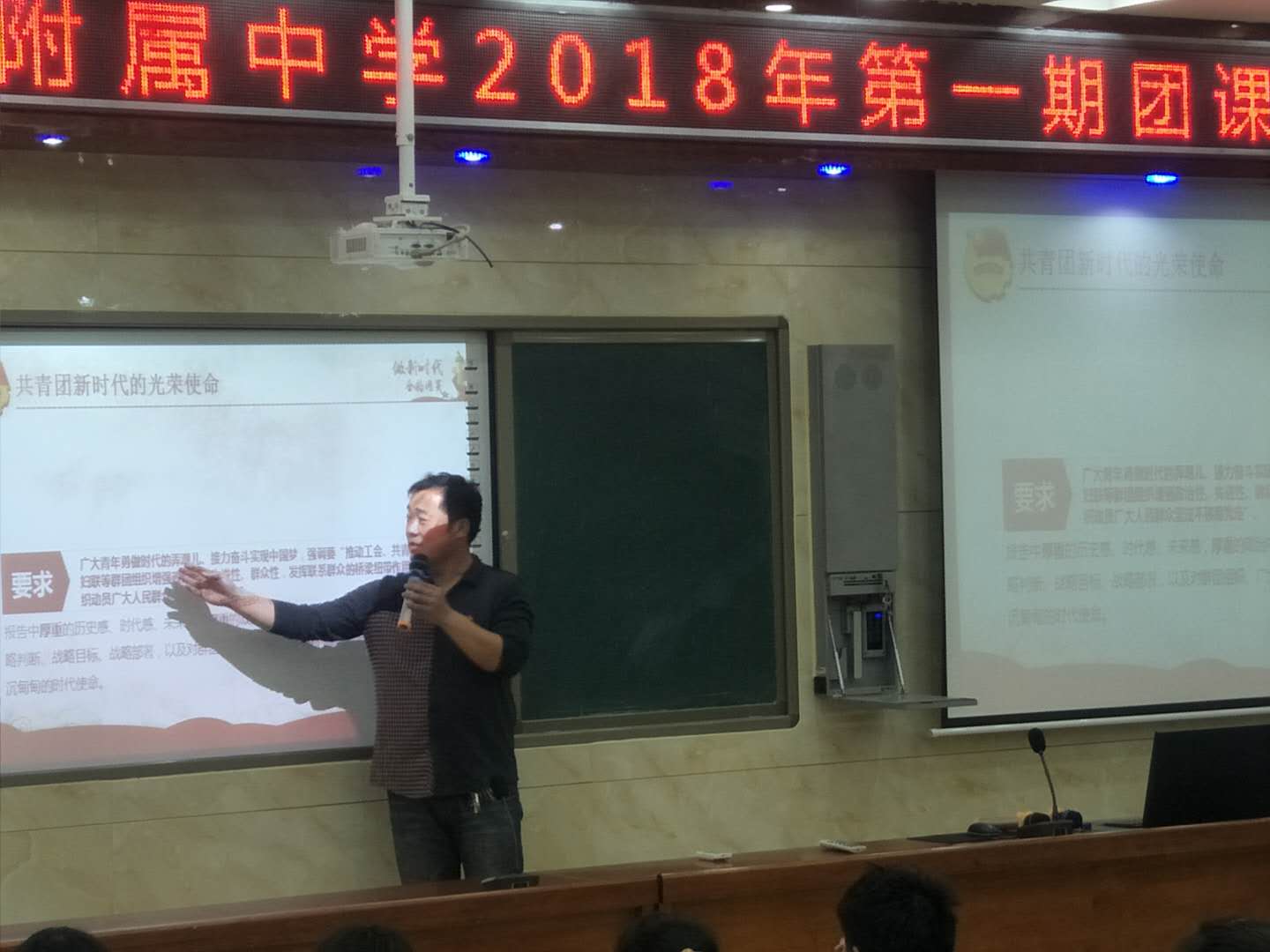 为深入学习贯彻习近平总书记系列重要讲话精神,扎实推进“学习总书记讲话,做合格共青团员”教育实践活动,切实增强团员的先进性和荣誉感,2018年5月7日,我校在阶梯教室举行“做新时代合格团员”主题团课。