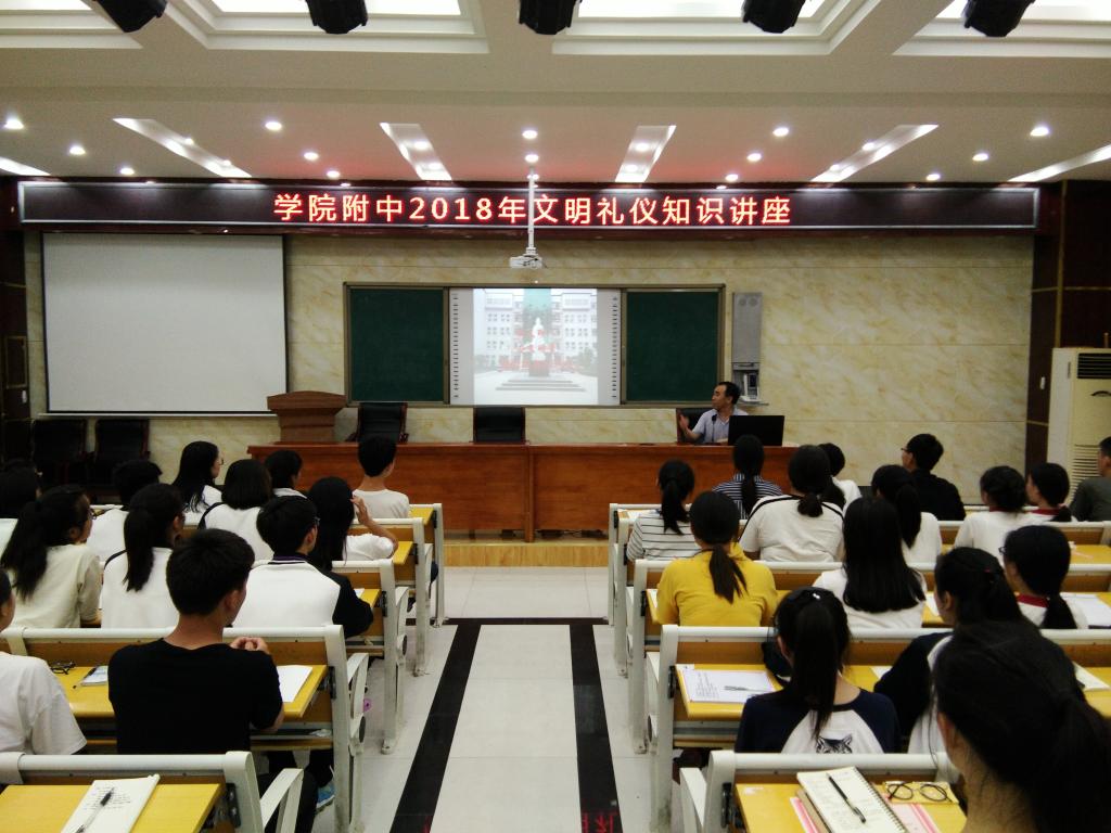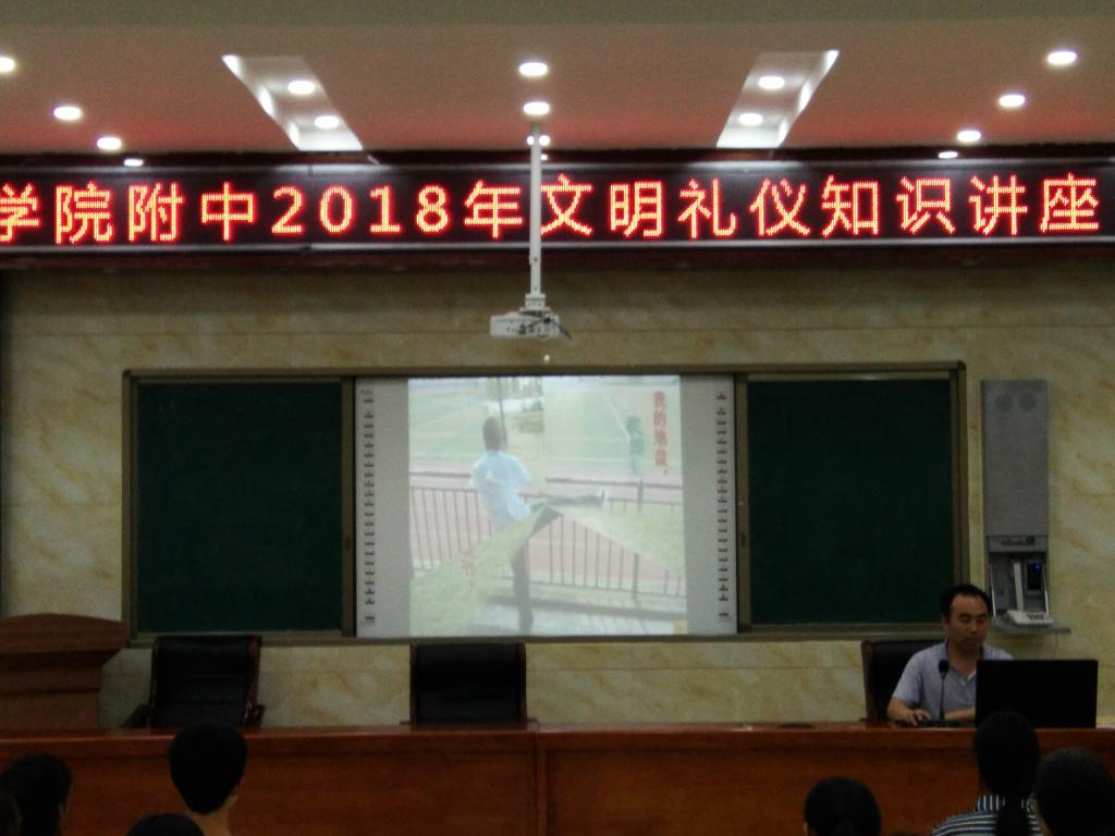 为进一步提升校园文化氛围,增长学生文明礼仪知识,培养学生良好的行为习惯,5月16日下午,学校在阶梯教室举办 “树文明之貌,行礼仪之风”文明礼仪知识讲座。由政教科长马学增主讲,200余名师生代表参加。