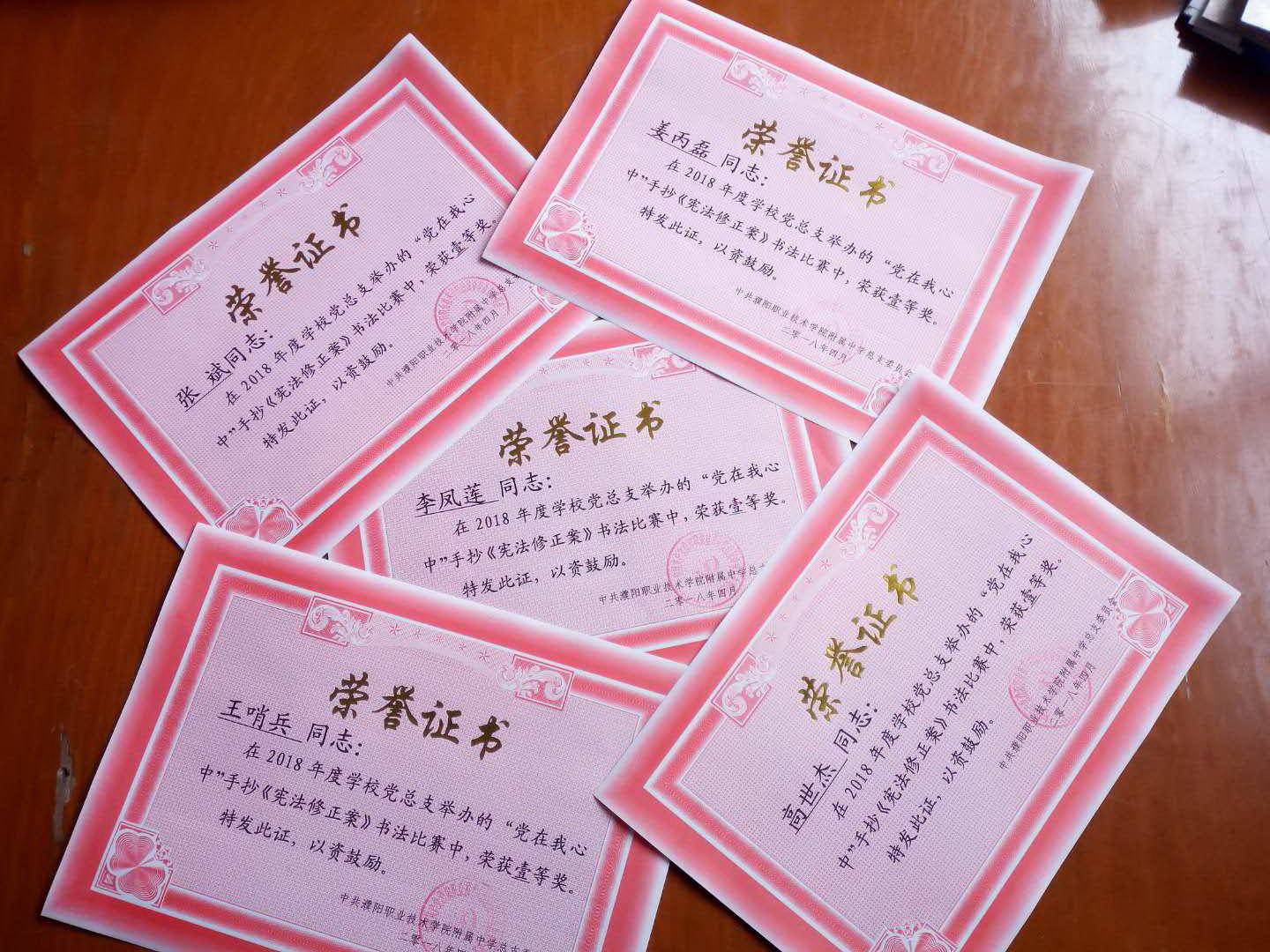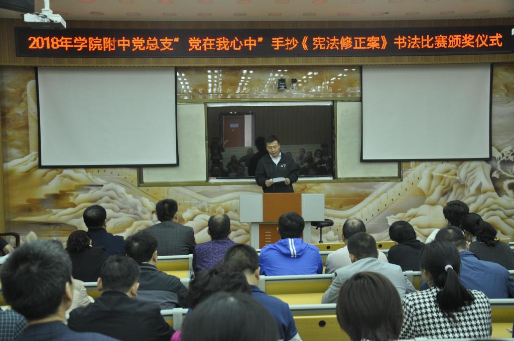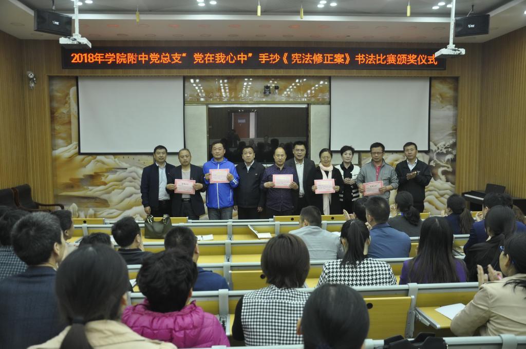 4月23日下午,我校党总支在艺术楼录课室举行“党在我心中”手抄《宪法修正案》书法比赛颁奖仪式,党总支书记祁立新,校长田孝民,副校长陈学锋、郭红雷、杨彦廷及全体党员干部参加。