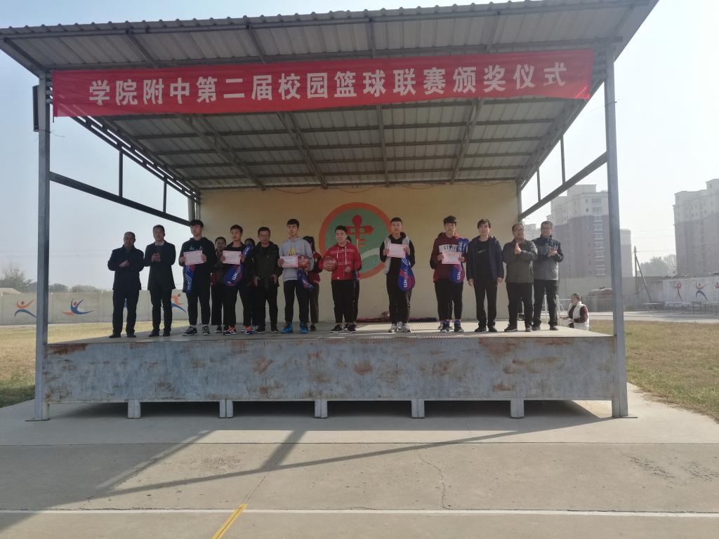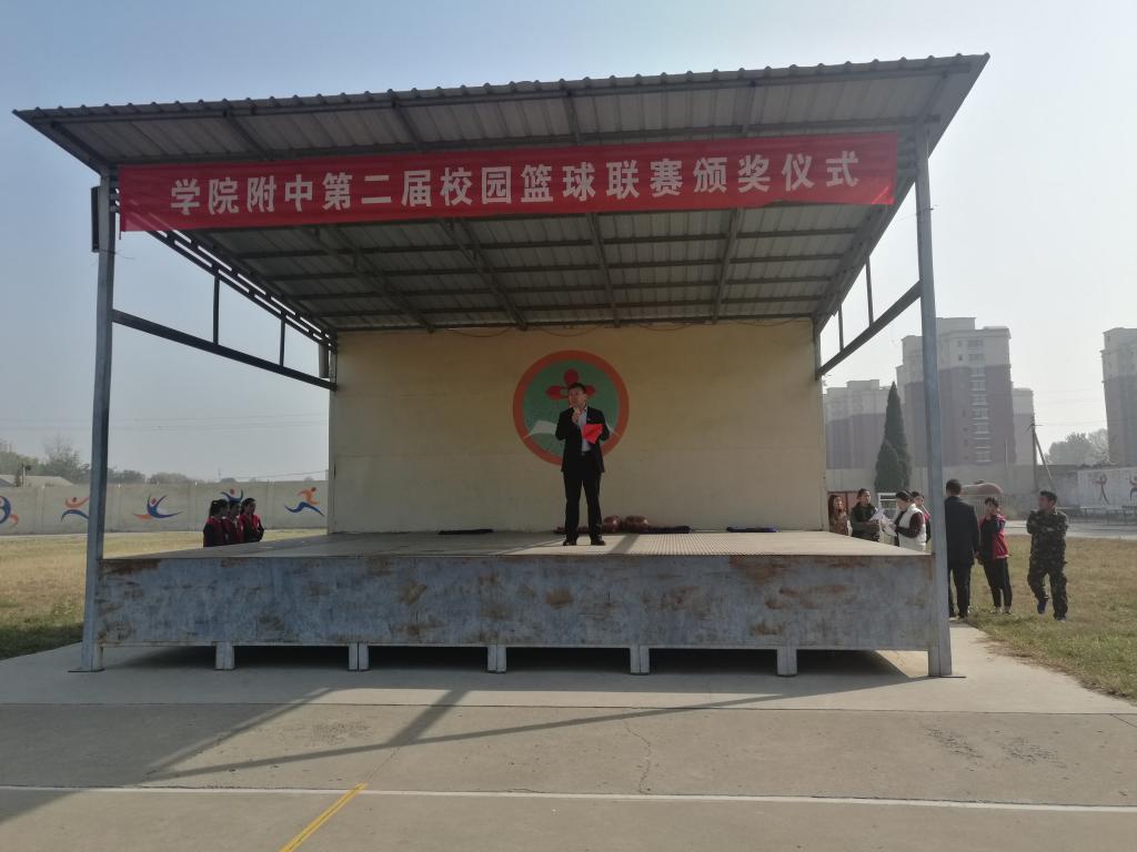 11月2日上午,在我校操场举行了第二届校园篮球联赛颁奖仪式,参加颁奖仪式的有副校长杨彦廷、政教科科长马学增、保卫科科长牛自凯和各年级主任。 在颁奖现场,杨校长致颁奖辞,他希望全体同学要学习运动员在球场上的拼搏精神,铭记在附中校园里留下的欢声笑语,实践“运动让我们快乐,篮球让我们执着”的活动理念。 篮球是媒介,体育是桥梁,通过这次篮球联赛,同学们以球会友,增进了友谊,展示了班级形象,凝聚了人心,丰富了在校的业余生活。它不仅培养着学生“各司其职、团结合作”的精神,锻铸这学生“坚忍不拔、勇往直前”的意志,弘扬着互相尊重和关爱的传统美德。