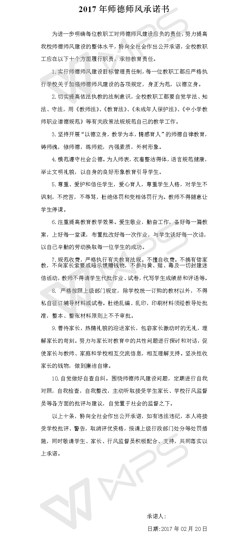 2017年师德师风承诺书