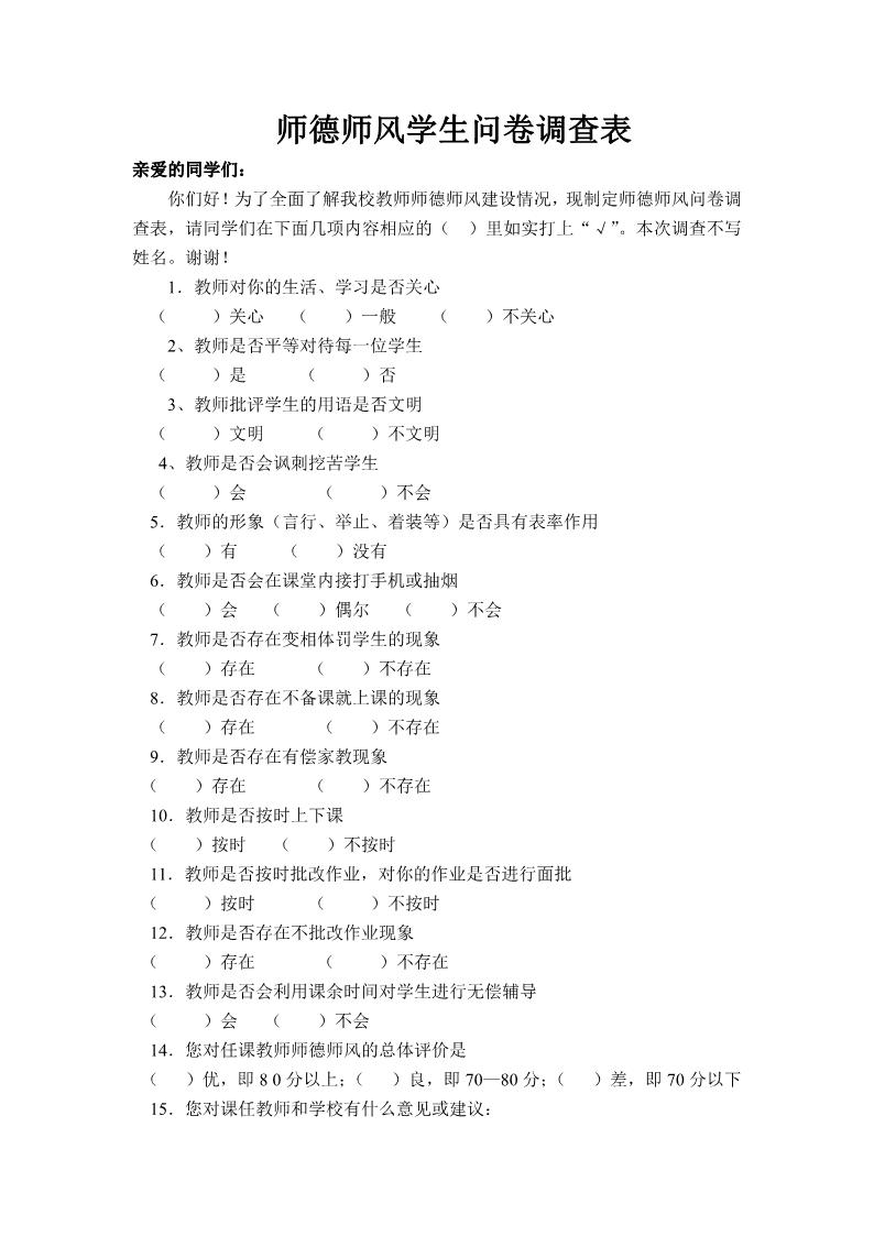 师德师风学生问卷调查表
