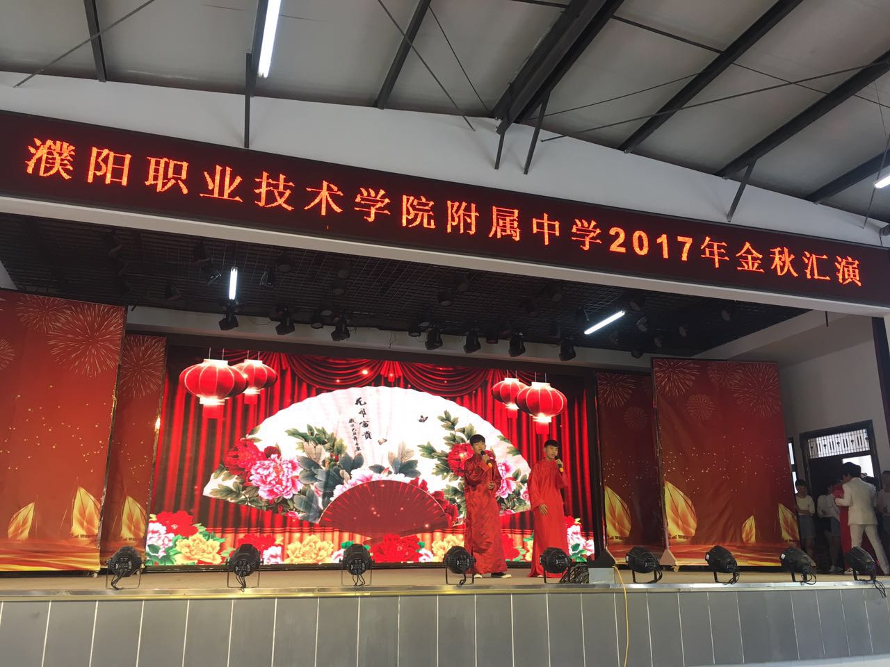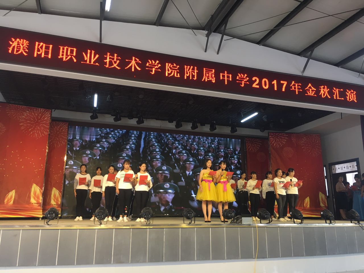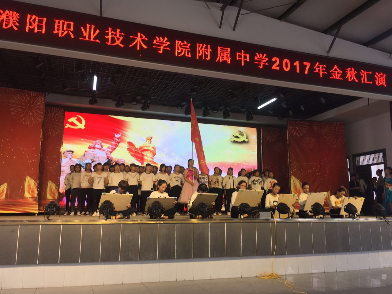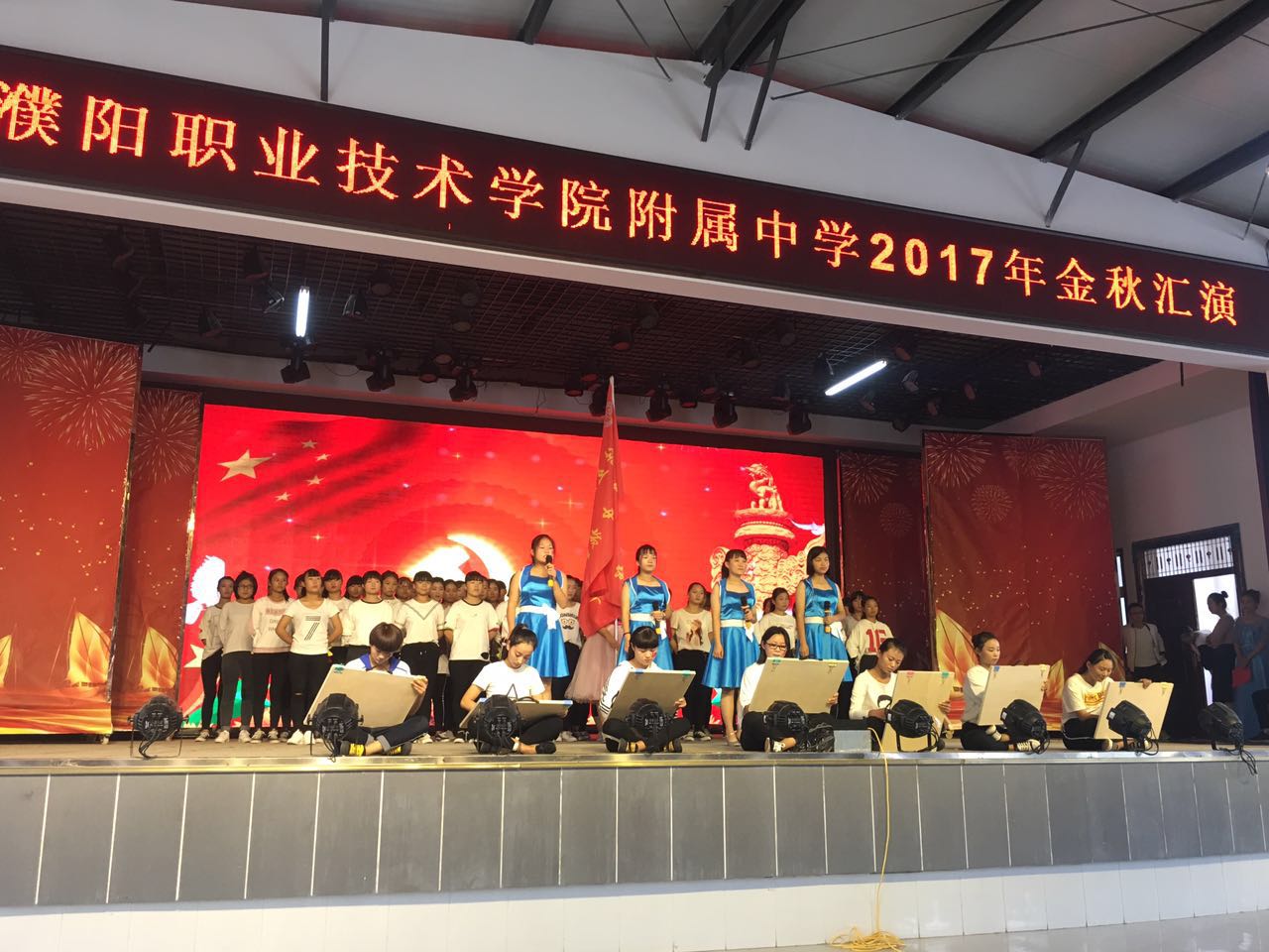 金秋送爽,硕果飘香,为歌颂祖国,喜迎国庆,欢度佳节,在国庆与中秋双节来临之际,2017年9月30日上午,我校中专部全体师生在新餐厅二楼举行《金秋汇演》。我校领导祁立新书记及中专部全体领导和老师们前来观看。