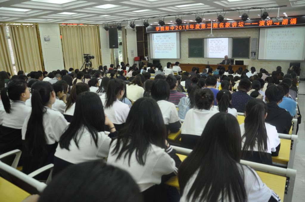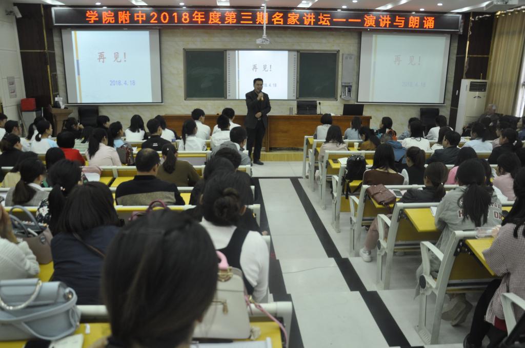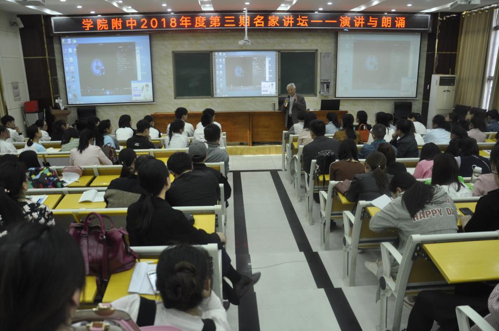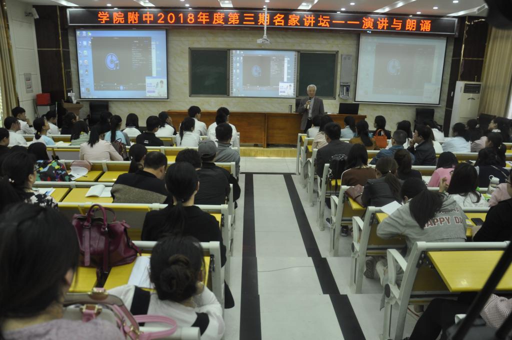 4月18日下午,全体教师齐聚阶梯教室,一起聆听了《演讲与朗诵》专题讲座。本次讲座特邀濮阳市创建“中华诗词之市”专家组组长、河南省演讲与口才学会副会长、《演讲与口才》杂志社顾问、全国演讲赛事评委专家组成员、全国演讲与口才学会联盟副主席许清林先生。
