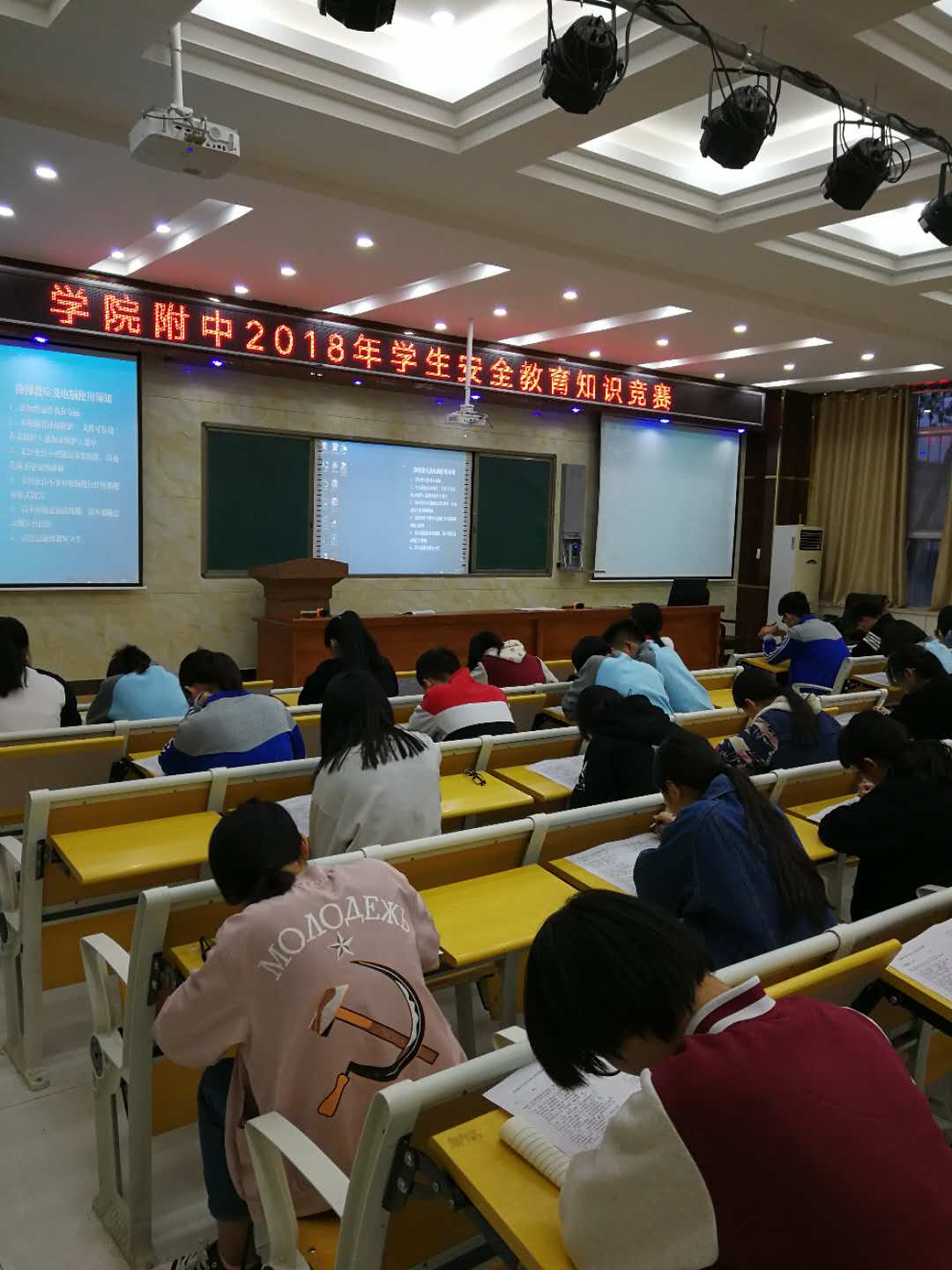 为进一步推进安全宣传教育,全面推荐安全知识进学校、进课堂,4月9日下午,我校在阶梯教室举行以“提高安全意识、构建和谐校园”为主题的安全教育知识竞赛。 本次竞赛目的在于提高在校学生的安全意识,危机处理能力,使其更好地保护自身的生命财产安全。通过本次活动,让学生更多地了解更多的安全教育知识,不要因为在安全知识上的无知,造成一些无法挽回的悲剧,防范于未然。以这样的活动,提醒学生留心身边点滴安全知识,提高安全意识,共同构建和谐校园。 作为当代学生,应该从这样的活动中学到更多安全教育知识竞赛方面的知识,应用于生活。我们还会继续开展此类活动,让同学们从中获益。构建和谐校园,共铸学院附中的辉煌。 整个考试过程,同学们遵守考场秩序,认真答题。